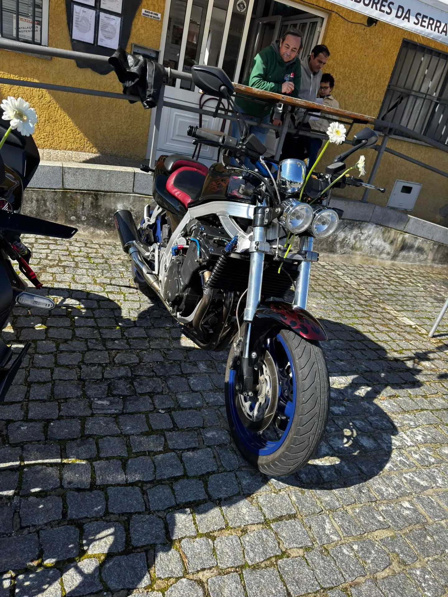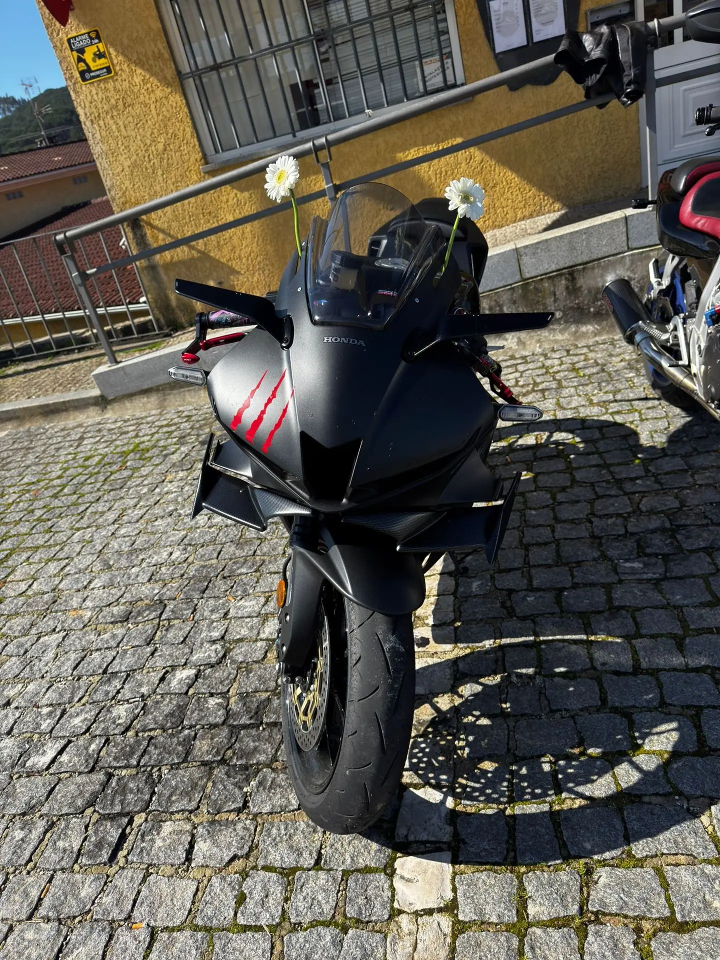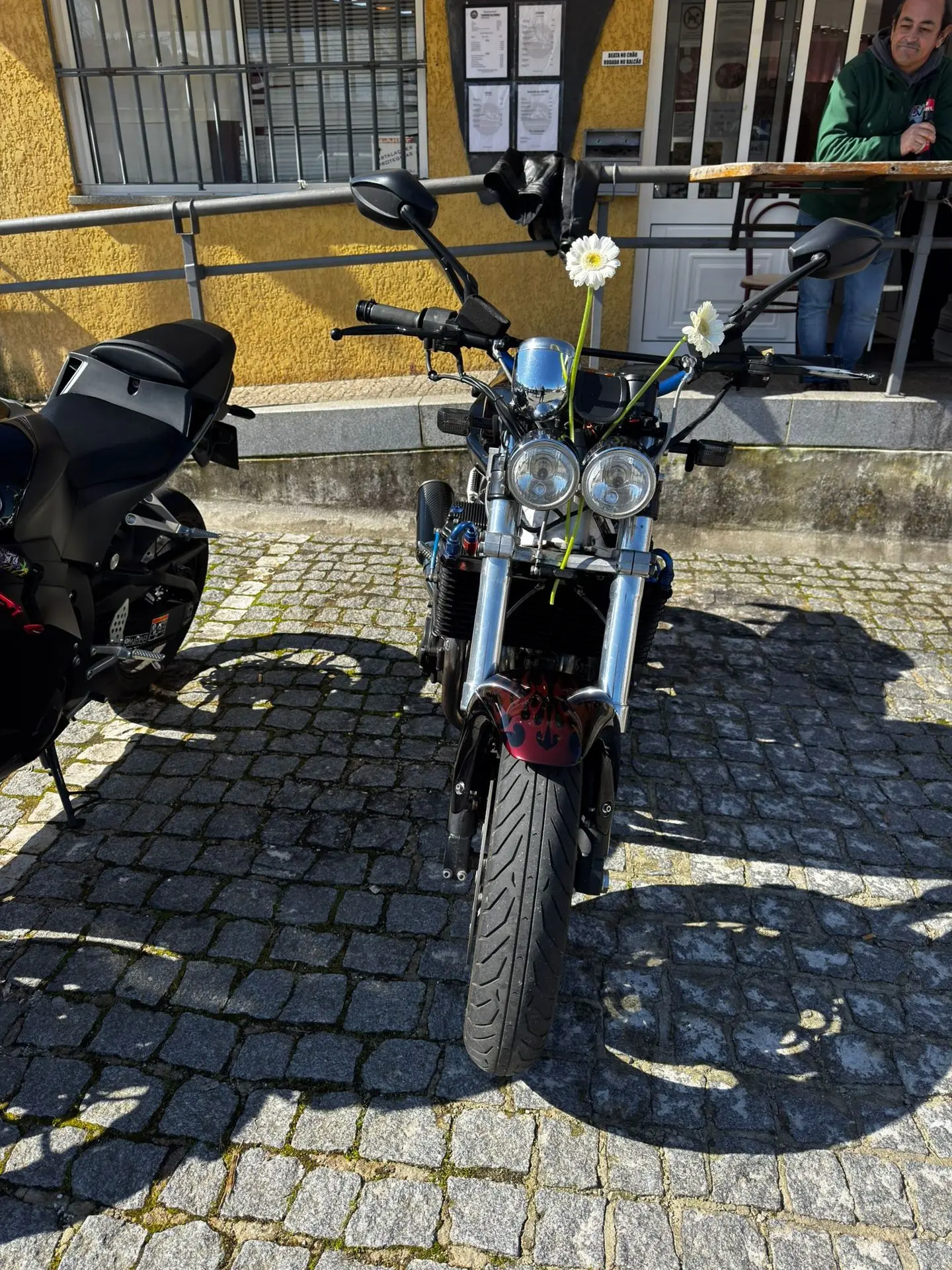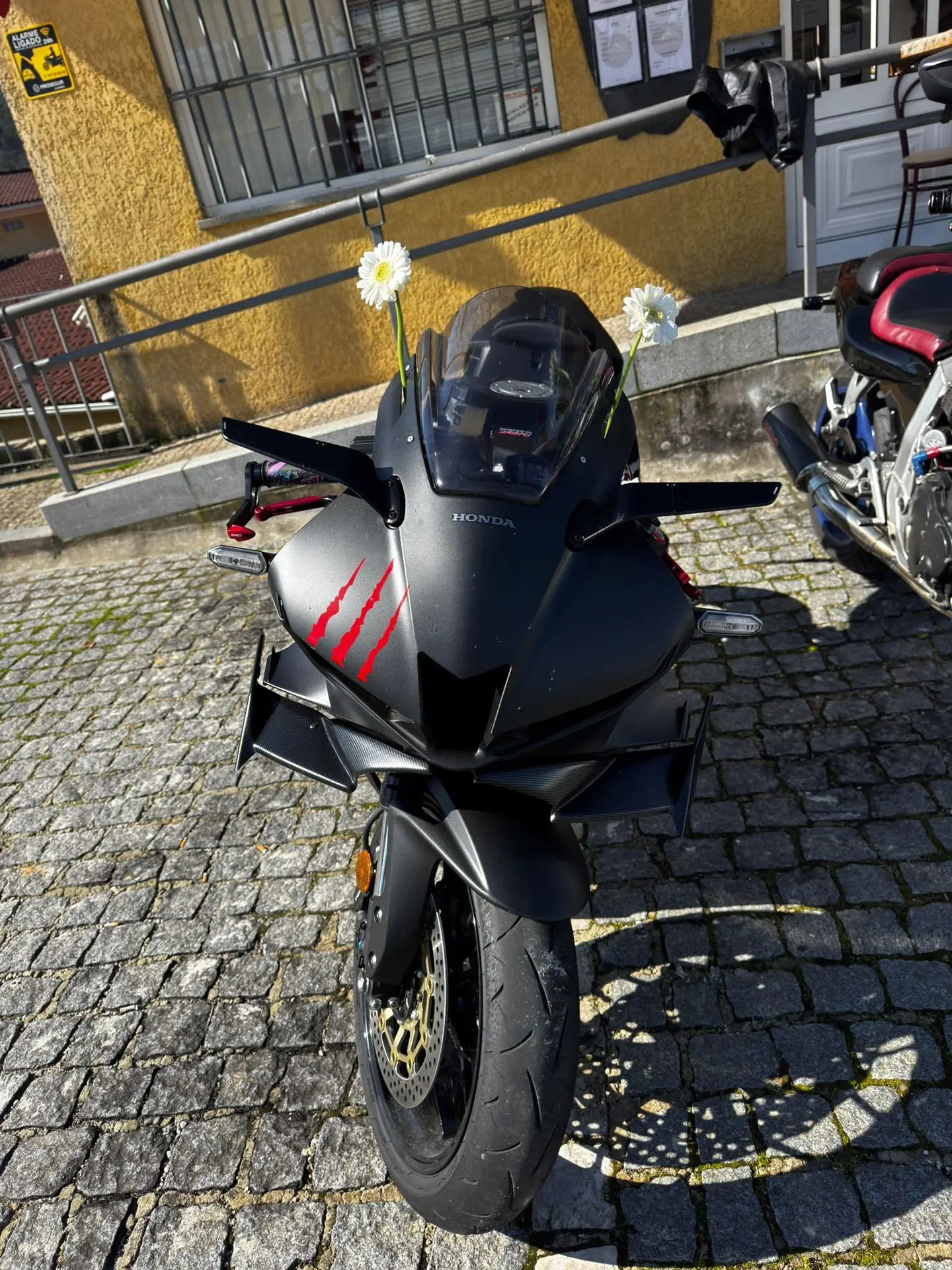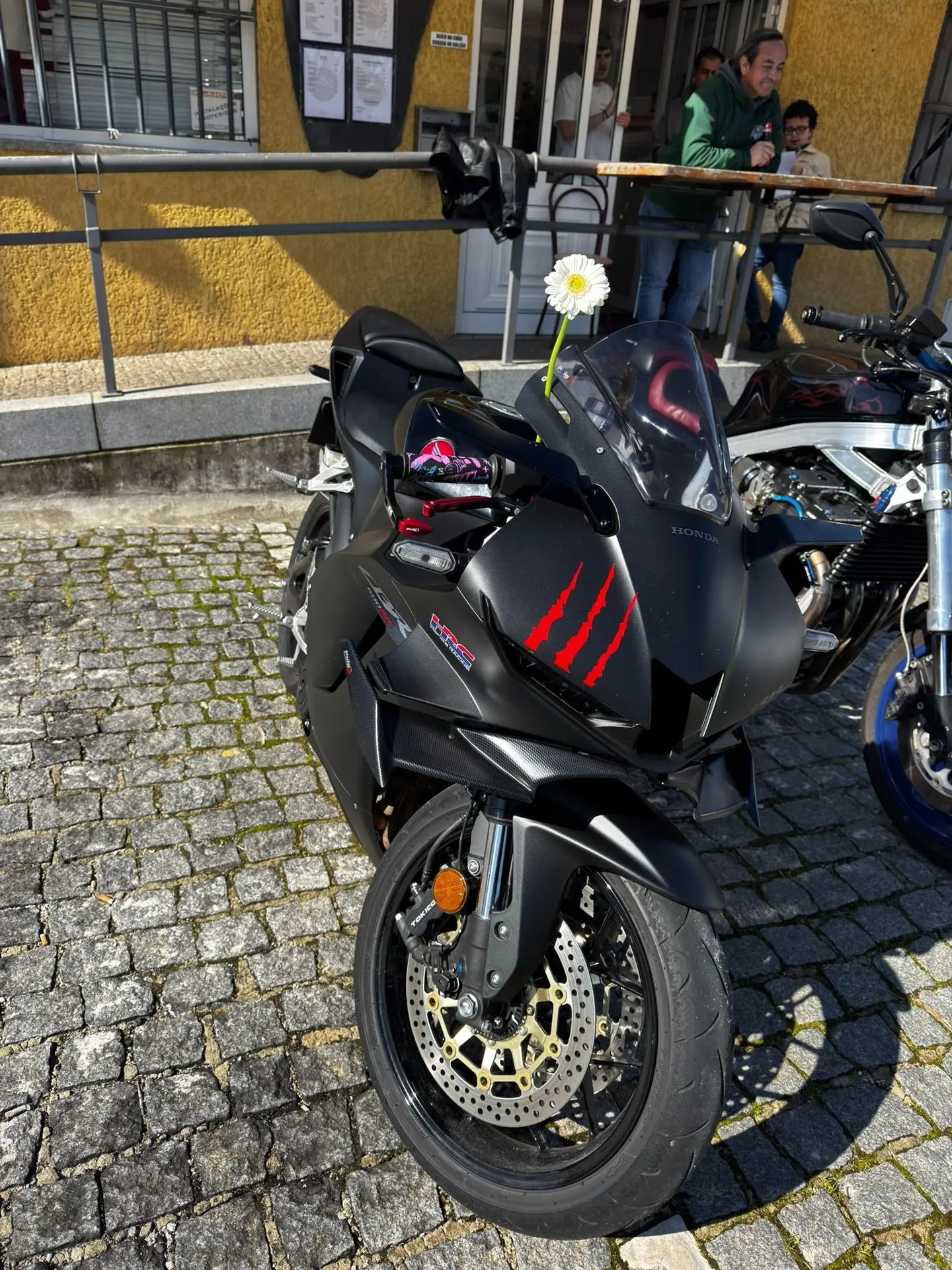 A cena mais emblemática do dia? Uma Honda CBR preta, agressiva, com adesivos de garras vermelhas no farol... e uma delicada margarida branca espetada na bolha. É o ápice do estilo "sou malvadão, mas amo minha mãe". Dizem que o dono da moto ganhou 5 cavalos de potência só com o poder do carinho.